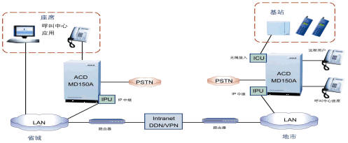 MD150A集成了IP電話技術(shù),通過內(nèi)置的IP中繼,可以將MD150A直接連到當(dāng)?shù)豅AN上,利用公司的計(jì)算機(jī)網(wǎng)絡(luò)(INTRANET),就可將話音通過IP的方式傳到另一端的MD150A,這樣兩臺MD150A就通過數(shù)據(jù)網(wǎng)絡(luò)連接到一起(組網(wǎng))。兩個(gè)系統(tǒng)間的分機(jī)可以進(jìn)行專網(wǎng)通信而無任何通話費(fèi)用。同時(shí)也大大提高了原數(shù)據(jù)網(wǎng)絡(luò)帶寬的利用效率。此外,通過IP中繼組網(wǎng)與使用ISDN組網(wǎng)一樣可以獲得所有功能,因此可以輕松實(shí)現(xiàn)遠(yuǎn)程呼叫中心的應(yīng)用。如圖所示:撥打到地市的客戶通過地方ACD的引導(dǎo)可轉(zhuǎn)移至省城的座席上獲得服務(wù),而沒有任何長途費(fèi)用和功能的減少。